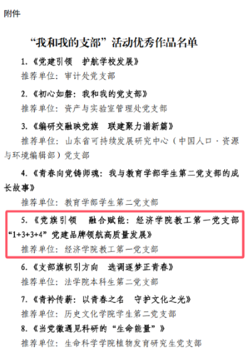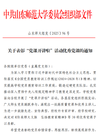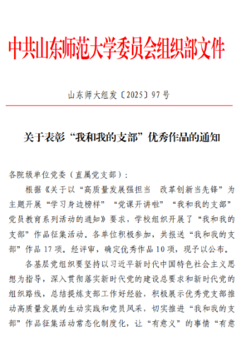 9月16日,中共山东师范大学委员会组织部公布了“我和我的支部” 、“党课开讲啦”两项活动的优秀作品表彰名单。我院教工第一党支部的作品入选“我和我的支部”优秀作品,本科生第三党支部书记李亚男的党课获评“党课开讲啦”活动二等奖。