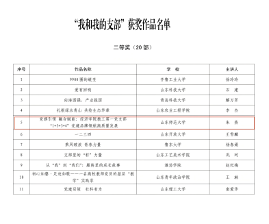 近日,在中共山东省委教育工委组织的全省高校“高质量发展强担当—改革创新当先锋”党员教育系列活动中,经济学院教工第一党支部报送的作品《党旗引领 融合赋能:经济学院教工第一党支部“1+3+3+4”党建品牌领航高质量发展》经历学校申报、专家评审、集体研究、结果公示四个环节,最终获评“我和我的支部”优秀作品二等奖。