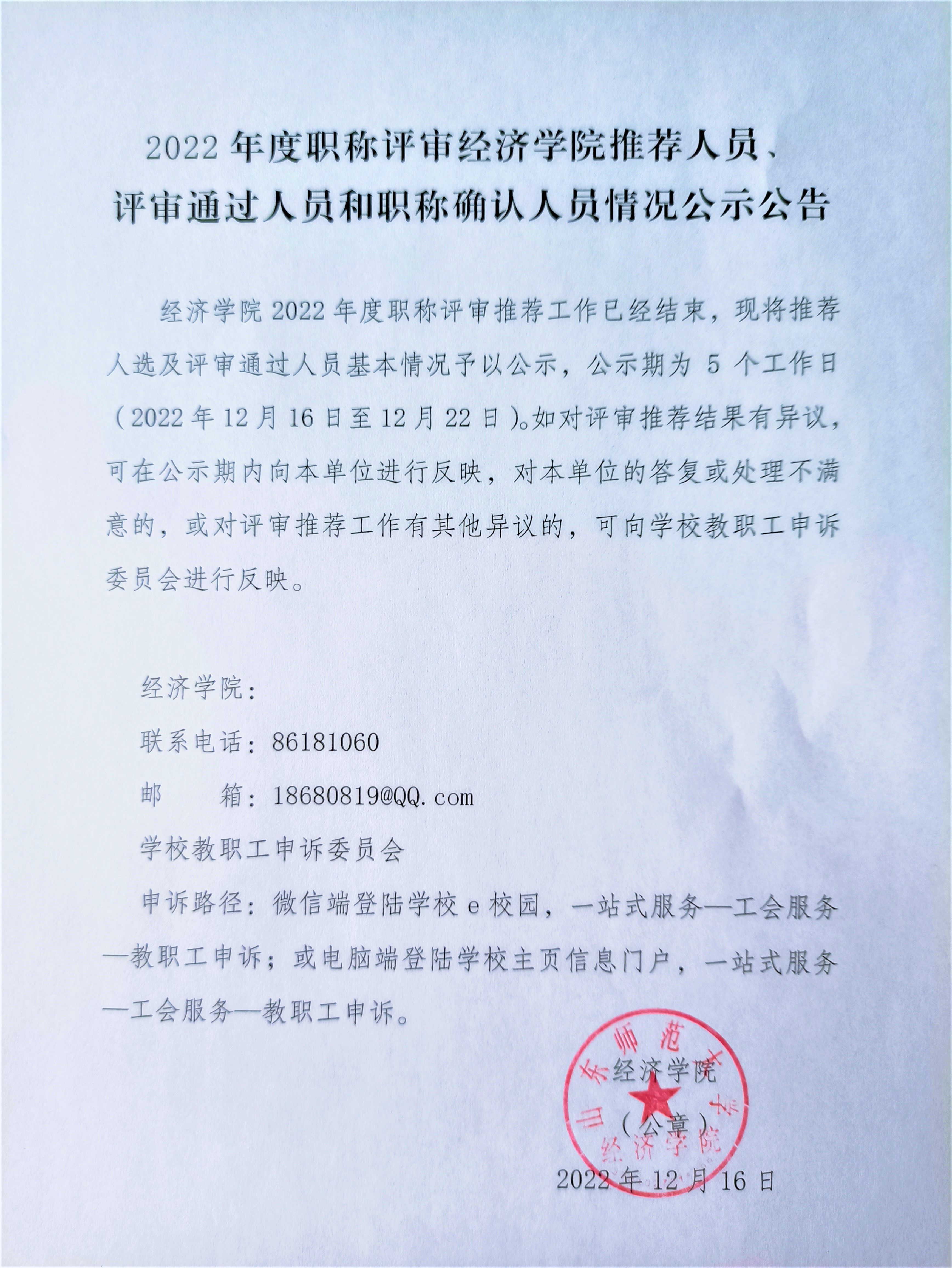 2022年度职称评审经济学院推荐人员、评审通过人员和职称确认人员情况公示公告