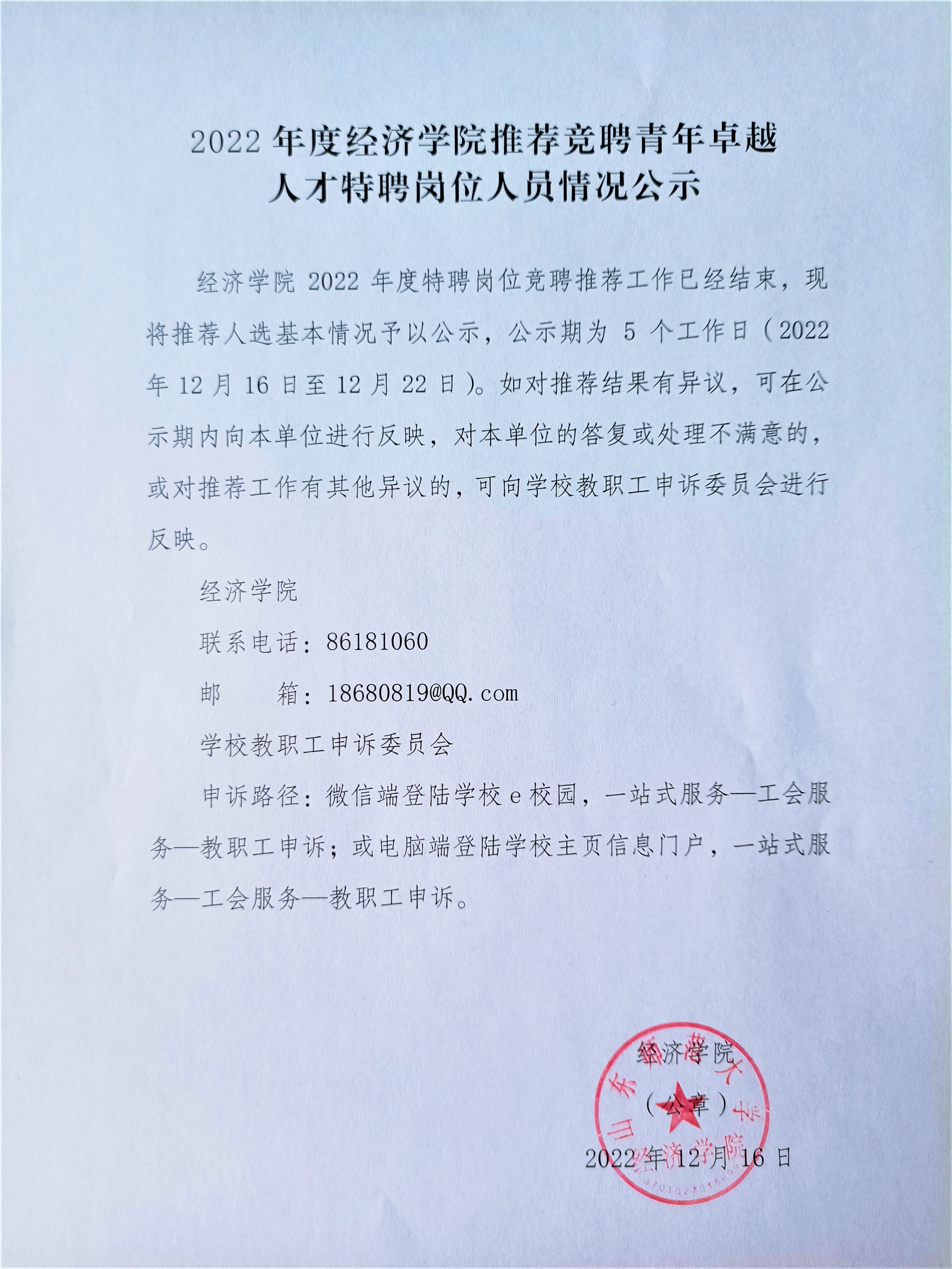 2022年度经济学院推荐竞聘青年卓越人才特聘岗位人员情况公示