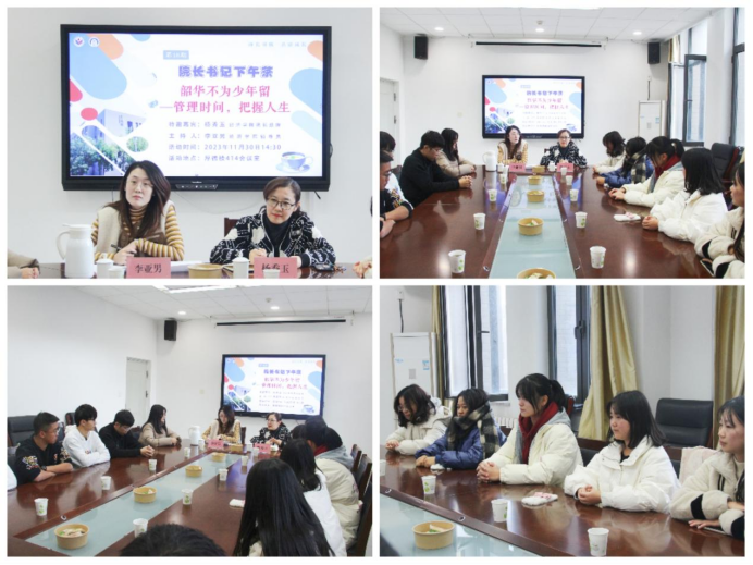 11月30日下午,经济学院于厚德楼414会议室举办第十八期“院长书记下午茶”活动。本期活动以“韶华不为少年留——管理时间,把握人生”为主题,由经济学院院长助理杨秀玉主讲,2023级辅导员李亚男主持,2023级学生代表参与活动。