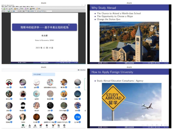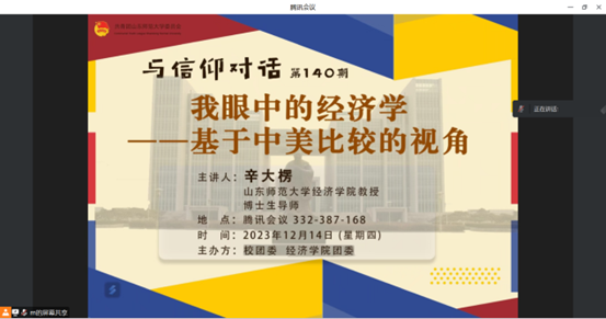 12月14日下午,山东师范大学团委与经济学院团委通过腾讯会议平台联合举办第140期“与信仰对话”报告会,本次报告会以“我眼中的经济学——基于中美比较的视角”为主题,由经济学院经济系主任辛大楞主讲,学生工作办公室主任、团委书记姚侃主持,2022级辅导员王学,部分本科生和研究生参加报告会。