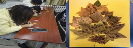 活动伊始,主持人讲解了气候变化在身心方面对个人的影响,并为同学们提供换季养生小贴士:多运动、勤通风、养习惯。继而,主持人向同学们提出倡议:在日常生活中增加体育锻炼,增强身体素质;宿舍勤通风,避免细菌滋生;饮食上,一日三餐不可少,养成良好的饮食习惯。随后,主持人组织同学进行“秋枫诉语”、“传声筒”、“表情绘”解压小游戏。在“秋枫诉语”环节中,同学们充分发挥个人想象力与创造力,结合自带的秋叶,设计并制作了独一无二的秋叶画,在创作中留下了秋日的独家记忆,并将秋叶保留或赠送,秋叶拼成的画赋予叶子新的生命力,使它的生命得到延续;“传声筒”将每一排同学为一个小组,依次传递一句话或一个词语,最后一版本与原版本进行比对;“表情绘”同学们将主持人制定表达词语用绘画的形式展现出来。最后,主持人总结本次活动,并对未来发出美好期盼。