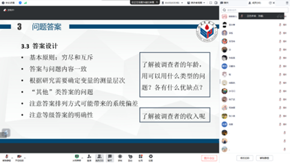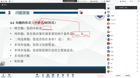 孙颖老师从调查方法出发,对调查前准备、调查过程以及调查后总结进行细致讲解,使同学们基本掌握了调查形式、调查对象以及问题答案设置等相关知识。随后,孙颖老师通过举例的方法讲解了如何编制调查问卷,包括问卷的开头部分、中间的问题设置等,她指出,涉及个人信息的问题应该尽量模糊,不应过于精确,而主要问题题型应该包括区间选择题、填空题以及量表题,且后两者的数量比例不应过高。对于量表题,孙颖老师主要介绍了李克特五点量表,使同学们初步了解了量表编制的基本要求。最后,孙颖老师对同学们提出的相关问题进行解答,帮助同学们更加明确如何通过调查问卷进行市场调研。