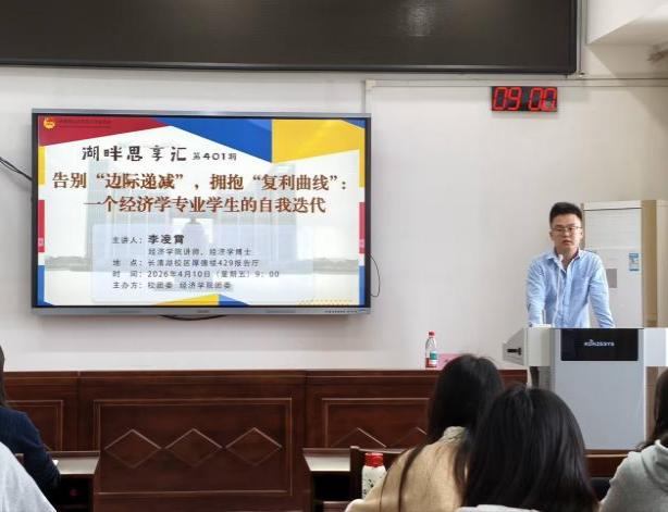 4月10日上午,由校团委、经济学院团委联合举办的第401期湖畔思享汇——“告别‘边际递减’,拥抱‘复利曲线’:一个经济学专业学生的自我迭代”主题讲座于长清湖校区厚德楼429报告厅举行。本次讲座由经济学院青年教师李凌霄主讲,学生工作办公室主任、团委书记姚侃主持会议,2022级辅导员王学以及学院本科生代表共70余人到场聆听。